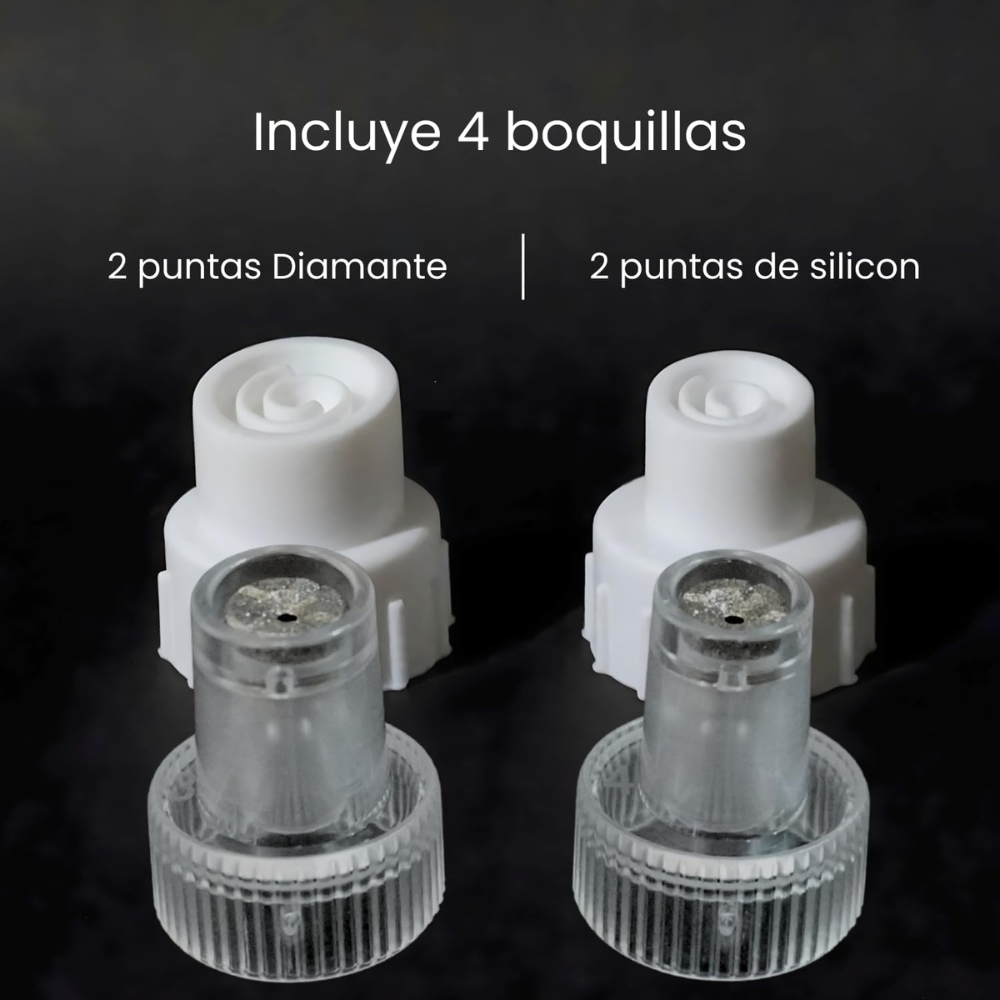 La ventaja de este Kit es que te da toda la variedad de boquillas que existen en el mercado al combinarlo con las boquillas normales que vienen en tu aparato desde fábrica. Este Kit incluye 2 más boquillas punta diamante para exfoliaciones con mejores resultados y 2 boquillas de Silicon.